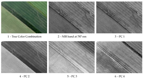 Hyperspectral sensors measure the reflected solar radiation in hundreds of contiguous and narrow spectral bands, and naturally excel at estimating different parameters in vegetated areas, from health status to average leaf area and chlorophyll content in the plants. These tasks are usually achieved by combining the information of specific spectral bands in what is usually known as a vegetation index or, more generally, a spectral index. Specific vegetation indices can provide important information on plant stress in the areas concealing buried archaeological relics, as shown through the analysis of spectra acquired on ground in []. Features obtained through other image analysis techniques, such as rotation of the feature space through Principal Components Analysis (PCA), may also provide additional insights regarding the presence of objects of interest []. PCA may also be employed to reduce the dimensionality of the images, facilitating the data exploration step.