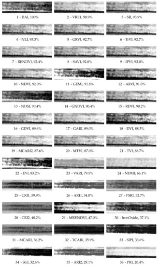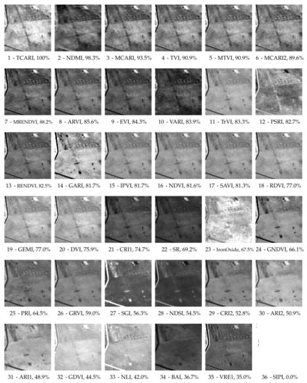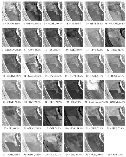 The ranking for the spectral indices collected in Appendix A is reported in Figure 7. In the figure, a performance expressed in percentage is derived for each index by comparing the related mutual information value with the one obtained by the best index. In order to display clearly the differences between the results, only a rotated relevant detail of the image is shown in the subfigures. For each subfigure a meaningful histogram stretch has been derived by applying a linear-with-2%-saturation stretch restricted to the area of interest. A visual analysis makes obvious that the top-ranked indicators clearly enhance the differences between crop marks and the surrounding areas: as the mutual information drops, concealed archaeological structures get harder to spot, up to becoming undetectable for an observer for the indices with associated lowest ranks.