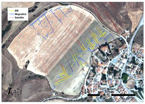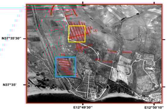 The studies carried in situ combined the employment of magnetic (multi-sensor SENSYS magnetometer MX system) and electromagnetic techniques (GEM-2 multifrequency EM and CMD multi-oils spacing EM), which were effective at revealing part of the ancient street system on the site (Figure 11). About 6–7 NW-SE streets were identified, having a width of about 6–7 m (Figure 12). Sections of the particular features are also visible in the high-resolution Quickbird and GeoEye-1 satellite image (the latter is not reported in this study), and in historical aerial photographs acquired from the 1960s and 1970s [].