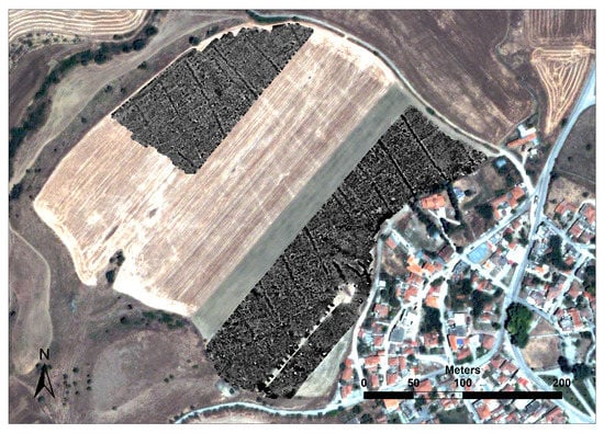 Various geophysical prospection surveys have been conducted in particular by the GeoSat ReSeArch Lab of FORTH, focusing on the Neolithic settlements of Bakalis and Velestino, the Hypereia spring and the Hellenistic stoa. In 2014, a more extensive survey aiming towards the study of the urban development of the site was carried out at the northern sections of the village, where the northern limits of the ancient Greek settlement were expected []. A high resolution spaceborne satellite image acquired on the 15th of June 2009 on the site by the Quickbird sensor is avalaible. The image comprises four spectral bands (RGB and NIR) with a GSD of 2.4 m. A true color subset indicating the locations of two areas used in next section is reported in Figure 4.