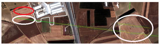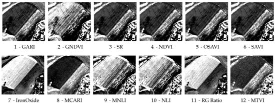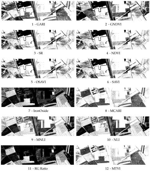 However, a detailed assessment of the qualitative and quantitative performance of spectral indices is still missing in the literature, as the quality comparisons carried out visually are usually estimated subjectively []. An assessment restricted to PCA and Tasseled Cap features concludes that the former is better suited for such tasks []. Nevertheless, PCA only represents a potential intermediate step for the analysis of these data, as it creates a new dataset with the same dimensionality of the original one, in which single principal components (PCs) with associated high eigenvalues must be anyway individually assessed to find the one better suited for cropmark detection. As the eigenvalues only reflect how much variance is captured by every PC, statistical variance in the data does not ensure that the same variations are present in the features of interest. In [], the authors compared more than 70 vegetation indices using both broad and narrow bands, calculated for different phenological stages of barley and cereal crops using ground spectroradiometers: the indices found as relevant were then evaluated on an image acquired by the EO-1 Hyperion spaceborne sensor on the Thessalian plain in Greece. The figure of merit used in the work to evaluate the effectiveness of the extracted features is based on the measured contrast in the area of interest, which may not be due to the actual presence of buried structures, as for the mentioned variance in PCs. Similar approaches computed spectral separability as a criterion to evaluate the efficiency of the different indices, without explicitly quantifying their difference in terms of performance [,,].