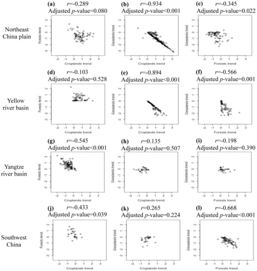 3.4. Spatiotemporal Changes of Croplands, Forests, and Grasslands during the Last Three Decades