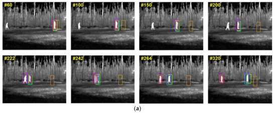 In this section, we qualitatively compare our tracker with other state-of-the-art trackers, including conventional gray level histogram-based particle filtering (PF) [10], mean-shift (MS) [9], incremental instance learning (IVT) [15], weighted multiple instance learning (WMIL) [21], accelerated proximal gradient L1-tracker (L1APG) [14], fast compressive tracking (CT) [17] and probability continuous outlier model (PCOM) [46], deep learning tracker (DLT) [25], and convolutional networks (CNT) [23] methods on the seven test infrared sequences. For fair comparisons, all of the compared methods are evaluated with their default parameter settings. Note that the particle numbers of PF, IVT, L1APG, DLT, and CNT are set to be 500 and their affine parameter standard variances are also the same as our tracker.