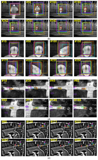 Given an initial target state in the first frame manually, the aim of a tracker is to predict or estimate the states of target in the following frames. The algorithms now available can be classified into three categories: generative approaches, discriminative approaches, and deep learning-based approaches. Generative methods aim to build an appearance model describing the target of interest and to search locally for the most similar image patch to the templates in each frame [8]. Mean-shift (MS) tracker, which was originally designed by Comaniciu et al. [9], employs an isotropic kernel function weighing the color or intensity histograms of template and candidate to measure their similarity quantitatively, after which the target in the current frame is located using a gradient descent method. However, the MS tracker cannot cope with the scale change of target and it has weaker robustness in infrared videos when compared with red-green-blue (RGB) videos. The conventional intensity histogram-based particle filtering (PF) tracker [10], which is also known as Sequential Monte Carlo algorithm, is one of the most widely-used trackers nowadays. The posterior probability density function of the state space is recursively approximated by the Bayesian model using finite samples [11]. During the past decades, many improved PF trackers, e.g., a hierarchical PF [12] utilized for multiple target tracking and an appearance-adaptive model that is integrated with a PF tracker [13] to achieve robust object tracking and recognition, have been developed. Xue et al. [14] proposed a sparse representation based L1 tracker under the PF framework. According to their study, the target of interest can be projected into a set of linearly independent basis, i.e., templates, with a sparse coefficient containing few non-zero entries, which denote the occlusion. The relevant experiments verify that the L1 tracker can achieve satisfactory performances in video sequences with distinct occlusions, but the computational efficiency is poor due to its relatively complex optimization. To deal with the difficulties caused by appearance variation, some online models, such as incremental visual tracker (IVT) [15], have been proposed. IVT can adapt online to the appearance change of target by means of incrementally learning a low-dimensional subspace representation and achieves promising computational efficiency in practice, but it turns out to be less effective on the condition that the occlusion is heavy or that the distortion is non-rigid due to its adopted holistic appearance model [15,16].