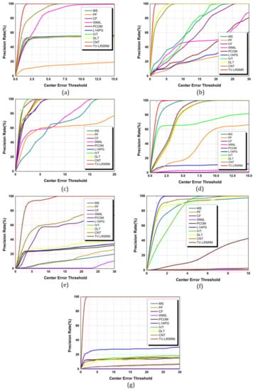 Precision plots: (a) Seq.1; (b) Seq.2; (c) Seq.3; (d) Seq.4; (e) Seq.5; (f) Seq.6; and, (g) Seq.7.