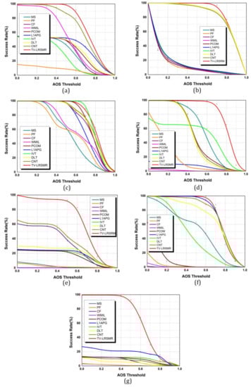 Success plots: (a) Seq.1; (b) Seq.2; (c) Seq.3; (d) Seq.4; (e) Seq.5; (f) Seq.6; and, (g) Seq.7.