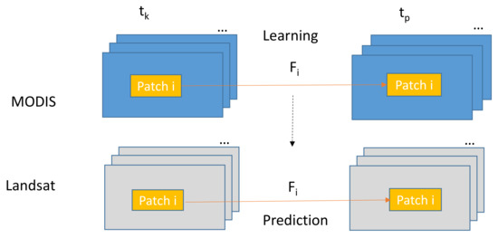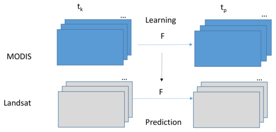 Figure 2 illustrates our proposed prediction approach. Based on the available MODIS images that were collected at and , we learn the pixel by pixel mapping between the two images. The learned matrix F is then applied in the prediction step. Using similar notations in related work [1], the prediction of Landsat image at can be achieved by
