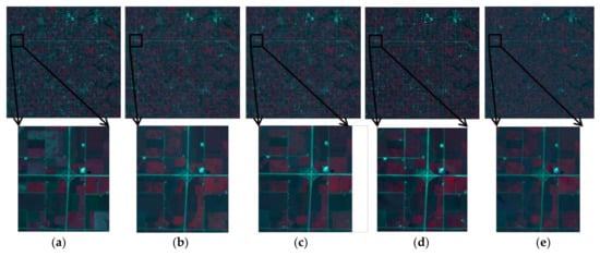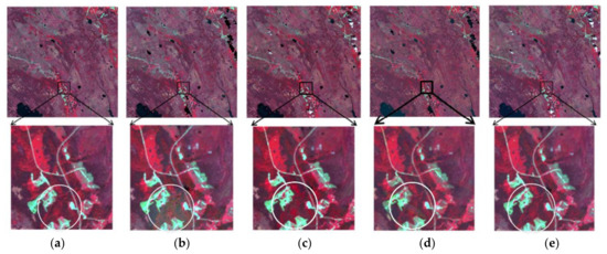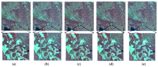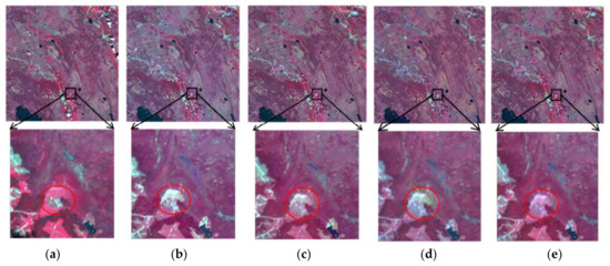 Comparison of forward prediction results of using Landsat image 192 to predict Landsat image 224. (a) Actual image; (b) STARFM; (c) FSDAF; (d); STI-FM; and, (e) HCM.