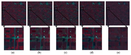 Comparison of forward prediction results of using Landsat image 128 to predict Landsat image 144. (a) Actual image; (b) Spatial and Temporal Adaptive Reflectance Fusion Model (STARFM); (c) Flexible Spatiotemporal Data Fusion (FSDAF); (d) SpatioTemporal Image-Fusion Model (STI-FM); (e) hybrid color mapping (HCM).