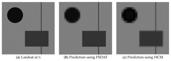 To further validate the performance HCM, we have carried out some additional studies. Similar to the FSDAF paper, we used a synthetic data set, as shown in Figure 9 below. There are three areas besides the background, which has a magnitude of 0.5. A small Gaussian noise (0.001) was added to the image. The pixel magnitudes in Landsat image at t1 are as follows: 0.01 in the circle (radius: 56 pixels), 0.3 in the rectangle and the line. The pixel magnitudes in Landsat image at t2 are: 0.05 in the circle (radius: 72 pixels), 0.2 in the rectangle and the line. The circles in the two Landsat images are to emulate gradual changes (phenology), and the lines and rectangle are to emulate land cover type changes. The MODIS images were generated by averaging 16 × 16 blocks in the Landsat images.