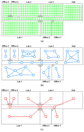 - Low-level map. It represents the images captured within the environment and the topological relationships between them. Figure 1a shows the low-level map of a sample generic environment. The green squares represent the capture points of the images.