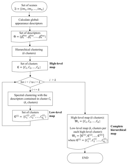 About the mapping process, the creation of the model is addressed in several stages. Firstly, a high-level map is built and, as a result, a set of clusters are created, which contain the images captured within each room. A hierarchical clustering approach has demonstrated to perform accurately in this task. Secondly, an intermediate-level map is built by classifying the images of each room into clusters that group images that have been captured from close points. In this case, a spectral clustering method has proved to be the optimal choice to solve the problem.