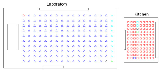 As for the creation of the intermediate-level map, the objective is that the algorithm groups together images that have been captured from geometrically close positions within each room. The preliminary tests have shown the inability of the hierarchical algorithm to solve this task. As an example, Figure 5 shows the result obtained after applying the hierarchical clustering algorithm to obtain the intermediate-level maps in the kitchen and the laboratory of the Bielefeld set. When this experiment was repeated in different rooms, it tended to create one cluster containing a high number of images, and some other clusters which had very few images or even a unique image. This behavior was almost independent of the configuration of the parameters. However, the experiments carried out with the spectral clustering showed a more consistent and more balanced separation, both considering the number of scenes per cluster and the geometrical closeness between capture points. The use of this algorithm in the intermediate-level mapping will be studied in Section 4.4.