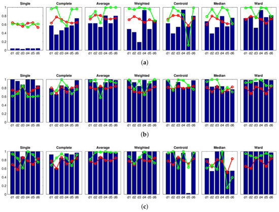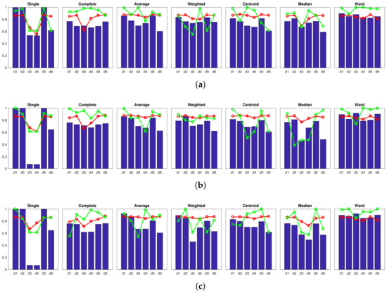 Usually, this kind of algorithm is implemented on the grounds of matrix theory. In every iteration of the clustering algorithm t, the two most similar clusters are merged to create a new cluster. There are several criteria that permit calculating the distance between the new cluster (which results from merging the two clusters and ) and a previous cluster . Depending on how we define this distance, a specific modality of the hierarchical clustering is obtained. Table 1 shows the most common expressions that can be used to calculate this distance. In this table, and are the cardinal numbers of the clusters and , respectively, is the p-th entity in cluster , and is the q-th entity in cluster .