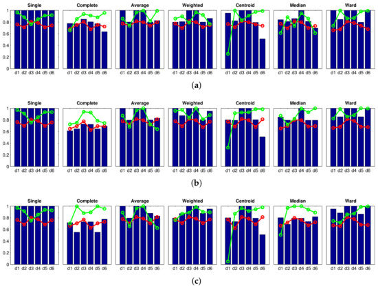 Finally, once the cutting level has been selected and therefore the data have been split into clusters, the consistency of the clusters should be evaluated. To this purpose, the height of each branch can be compared with the heights of the neighbors that are situated beneath. If the height of one specific link is approximately equal to the height of the links below it, that indicates that there is no distinctive separation between the objects grouped in this level of hierarchy. This means that these links have a low consistency, and pruning them would lead to unnatural clusters. In the same way, inconsistent links point out the limit of a natural division of the dataset. The relative consistency of each link in a hierarchical clustering tree can be quantified through an inconsistency coefficient . This value is the result of comparing the height of the links situated in the pruned level with the average height of the links beneath it. Therefore, it is a measurement of the consistency of a specific division into k clusters from the original data. In each experiment, this coefficient has been normalized to take a maximum value equal to 1. This way, the higher this coefficient is, the more natural the final clusters are.
