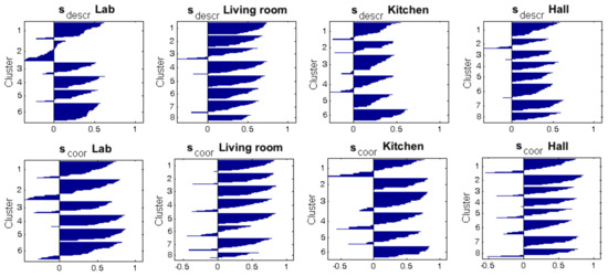 Firstly, Figure 14 shows the shape of the clusters of the intermediate-level map, considering the four rooms of the Bielefeld dataset and gist with , . The capture points of the images are shown as small squares, whose colors indicate the cluster they belong to. Each room was previously separated through a high-level mapping process and then the images of every room underwent an intermediate-level clustering process. The results of this process are shown with an independent code of colors per room. All the clusters are noticeably compact and the number of images per cluster is balanced, independent of having different grid sizes per room (Table 2). This result could be reported as successful, and it confirms the capability of the gist descriptor to address mapping tasks. Continuing with this descriptor and configuration, Figure 15 shows graphically the silhouettes of the descriptors (top row, one graphical representation per room) and the silhouettes of the coordinates of the capture points (bottom row). In general terms, they take relatively high values, and this confirms the validity of this configuration.