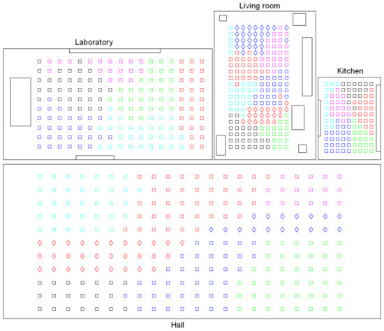 Results of the intermediate-level mapping using Fourier signature with components per row. Bird’s eye view of the four rooms of the Bielefeld set. The colors of the capture points indicate the cluster they belong to.