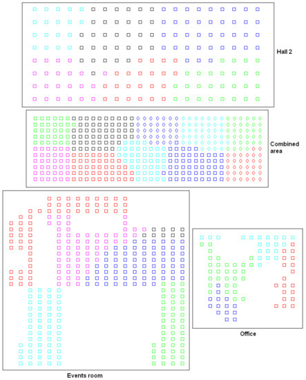 Secondly, another experiment is performed to create groups of images in order to obtain the intermediate-level map, using the approach presented in Section 4.4. In this experiment, we make use of the gist descriptor with masks, since it has presented the best results in the previous test (Figure 19). Figure 21 shows the results obtained with the four additional rooms considered (the results obtained with the other rooms are the same as those shown in Figure 14). Like in the experiment of Section 4.4, the results are successful when all the rooms are considered. Despite the different grid sizes and the visual aliasing phenomenon, the clusters tend to be geometrically compact.