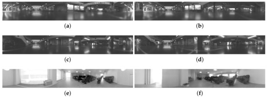 Sample panoramic images extracted from the database. (a,b) were captured from two distant positions of the hall, (c,d) were captured from two distant positions of the hall 2 and (e,f) were captured from two different poses of the events room.