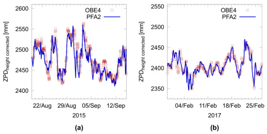 Height corrected zenith path delay from the permanent GNSS network EUREF for two stations (OBE4: Oberpfaffenhofen, Germany; PFA2: Bregenz, Austria) nearby the DLR calibration field covering an observation period of one month for S-1A acquisitions during summer 2015 (a) and for S-1B early in 2017 (b).