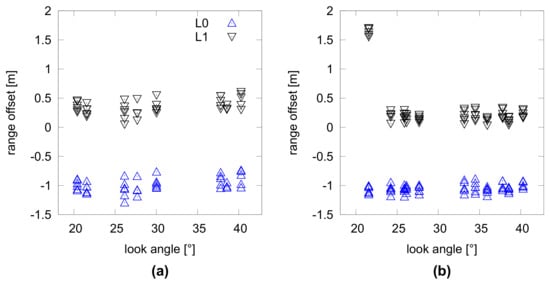 Range offset derived from corner reflector responses for S-1A (a) and S-1B (b) obtained using both product types: L0 products (blue) and L1 products (black).