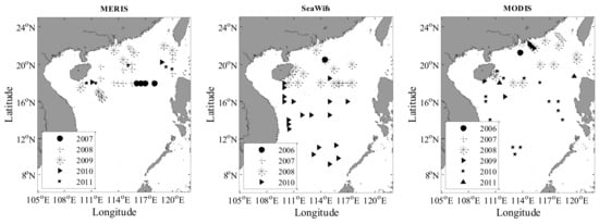 MODIS (Aqua), SeaWiFS, and MERIS (Reduced Resolution, RR) Level 2 (L2) data products were downloaded from NASA’s OceanColor website (http://oceancolor.gsfc.nasa.gov/). These data were processed by the l2gen operational software program (processing versions R2014.0, R2014.0, and R2012.1 for MODIS, SeaWiFS, and MERIS respectively). For SeaWiFS, Global Area Coverage (GAC, spatial resolution 4 km) data were used (Because data were available only for SeaWiFS GAC from 2007 to 2010 in the SCS). Previous studies have indicated minimal differences between the results of GAC and MLAC (Merged Local Area Coverage) retrieval products and in situ data in the SCS [22,23].