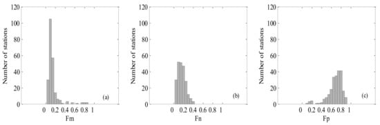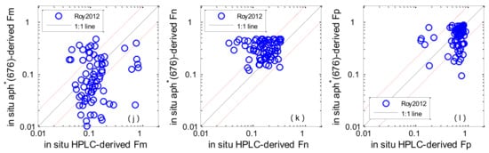 Figure 4a–l shows the performances of different algorithms when in situ Chl-a and aph * (676) were used as the algorithm inputs. The statistical results of MR, SIQR and RMSE are shown in Table 4. Concerning picoplankton, Brewin2010 performed with the highest accuracy, with a median bias of 6.8% (MR = 1.068) and the RMSE was 44.5%; Uitz2006 and Hirata2011 slightly underestimated values at the higher end of measured Fp, with median biases of −35.3% and −28.1%, and RMSEs of 205.3% and 148.8% respectively. Concerning microplankton, Uitz2006 and Brewin2010 performed with higher accuracy—the RMSEs for the Fm were 32.7% and 38.8% and the MR were 1.20 and 0.91, respectively; Hirata2011 underestimated Fm when the fractions were low, with a median bias of −39% (MR = 0.61). The detection of nanoplankton was generally worse than those of microplankton and picoplankton, Brewin2010 showed the best performance (Fn) among all algorithms.