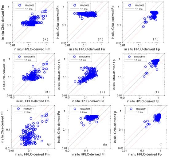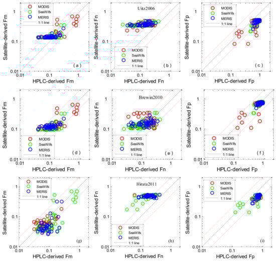 Scatter plots of satellite-derived PSCs versus in situ measurements: Uitz2006 (a–c); Brewin2010 (d–f); Hirata2011 (g–i). The solid line is the 1:1 line. The red dashed lines are the 1:2 and 2:1 lines.