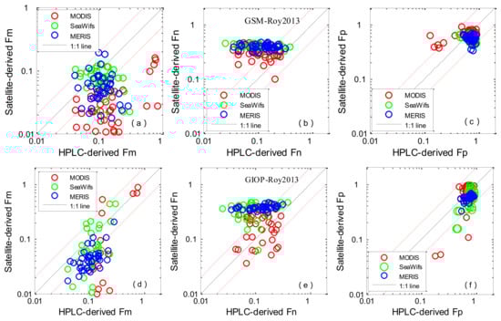 All algorithms were applied to the ocean colour satellite products of MODIS, SeaWiFS and MERIS, and the derived values were compared with the in situ HPLC data (Figure 5 and Figure 6). The statistical results are shown in Table 5 and Table 6. When comparing the results from the four methods listed in Table 1, it firstly appears that abundance-based algorithms performed with higher accuracy than the IOP-based method. For abundance-based algorithms, the evaluation results using in situ and satellite-derived Chl-a showed good tendency towards accuracy. Concerning picoplankton, Brewin2010 performed with the highest accuracy—the median biases of the three satellites were −0.02%, −0.51% and −0.49% for MODIS, SeaWiFS and MERIS, respectively, the RMSEs were 81.6%, 52.1%, and 56.5% and the coefficients of determination were 0.61, 0.61, and 0.40, respectively. For Uitz2006 and Hirata2011, underestimation of the satellite-derived Fp was observed—the average median satellite/in situ ratios were 0.65 and 0.70. Concerning microplankton, Uitz2006 and Brewin2010 were found to perform with higher accuracy—the median biases of the three satellites were 21.8%/−3.5%, 36.2%/17.0% and 25.8%/5.5% for MODIS, SeaWiFS and MERIS, respectively and the RMSEs were 59.4%/68.0%, 18.1%/15.4%, and 18.7%/16.9%; Hirata2011 underestimated the measured Fm when the concentration of microplankton was low, with median biases of −37.0%, −20.0% and −40.1%, and RMSEs were 70.9%, 21.4% and 35.7% for MODIS, SeaWiFS and MERIS, respectively. Concerning nanoplankton, Uitz2006 and Hirata2011 were found to have bad performances, the average RMSEs were 52.1% and 56.6%. With regard to the aph * (λ)-based PSCs algorithm, the performances of GIOP-Roy2013 and GSM-Roy2013 are shown in Figure 6, and the corresponding statistical results are provided in Table 6. GIOP-Roy2013 performed with higher accuracy for detecting microplankton than GSM-Roy2013, especially when Fm was high. Concerning picoplankton, when Fp < 0.5, GSM-Roy2013/GIOP-Roy2013 showed an overestimation/underestimation. MODIS derived Fn (GIOP-Roy2013) seemed to have higher accuracy than MERIS and SeaWiFs.