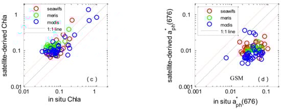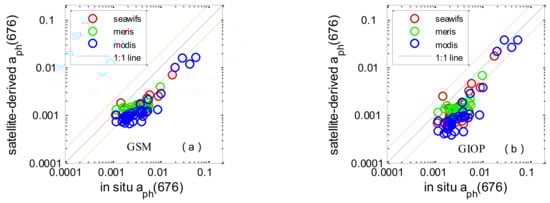 The comparison statistics associated with Chl-a and aph(676) are shown in Table 7. The Chl-a concentrations derived from SeaWiFS, MODIS, and MERIS data were lightly overestimated, with average satellite/in situ ratios of 1.22, 1.31, and 1.83, respectively. The RMSEs were 20.1%, 38.9%, and 26.1%. The average coefficients of determination were 0.64. Two IOP algorithms (GSM and GIOP) were used to derive the absorption coefficient of phytoplankton, and the results clearly showed that they underestimated the measured aph(676). The assessment showed a similar tendency towards accuracy between GSM and GIOP derived aph(676). Underestimation of aph(676) and the slight overestimation of Chl-a could lead to an underestimation of a * ph(676), which is the input of Roy2013 (see in Figure 7). As for a * ph(676), the validation result exhibited dispersion and poor statistical correlation, the average RMSEs for SeaWiFS, MODIS, and MERIS were 43.9%, 44.5% and 48.3% and the R2 values were 0.03, 0.04 and 0.007.