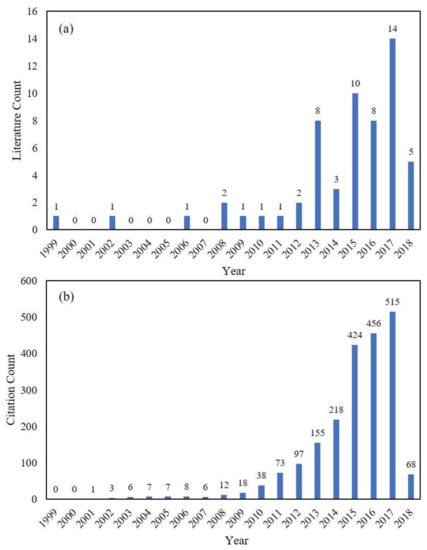 (a) Yearly literature counts of journal papers introducing spatiotemporal data fusion methods and (b) citation counts of these papers in Web of Science. The search was conducted on 10 March 2018.