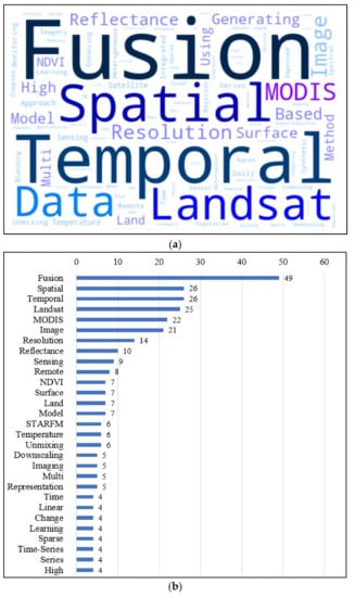 Currently, “spatiotemporal data fusion” is a term commonly used to name this type of data fusion technology. This term can well distinguish this type of fusion methods from traditional pan-sharpening methods which only improve images in spatial and spectral domains. However, in the early years, the names are quite inconsistent. Developers named their methods in different ways. This can be reflected by the words used in the titles (Figure 3a) and keywords of the 58 methodology papers (Figure 3b). “fusion”, “spatial”, and “temporal” are frequent words used in titles and keywords which exactly reflect the nature of spatiotemporal data fusion, i.e., technology to improve spatial and temporal resolutions of multi-source satellite images. “MODIS” and “Landsat” are also frequently used in the titles and keywords, suggesting that most spatiotemporal data fusion models were proposed to fuse MODIS and Landsat data or used them as representatives of coarse images and fine images respectively. Although most spatiotemporal fusion methods were applied to data from satellites listed in Table 1, it is worthwhile to mention that spatiotemporal fusion methods can also fuse high-resolution images from commercial satellites, especially for small-scale studies. For instance, the 5 m RapidEye images was fused with 30 m Landsat images to improve the detection of local forest disturbance [71].