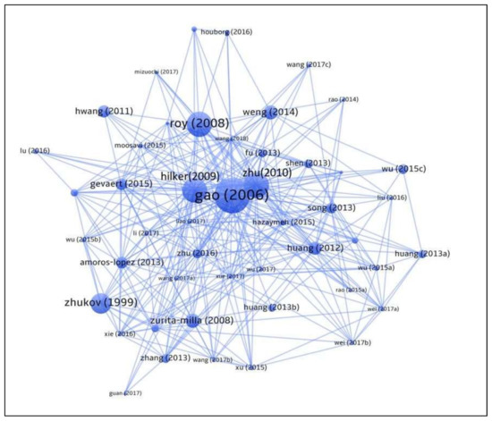 The literature citation map was plotted by VOSViewer (Figure 4). The most cited paper is the one developing STARFM [8] which has been cited by most other methodology papers. Other high-citation papers include ones developing ESTARFM [11], STAARCH [27], and a semi-physical fusion method [19]. These papers are in the center of the citation map.