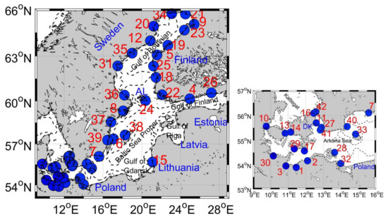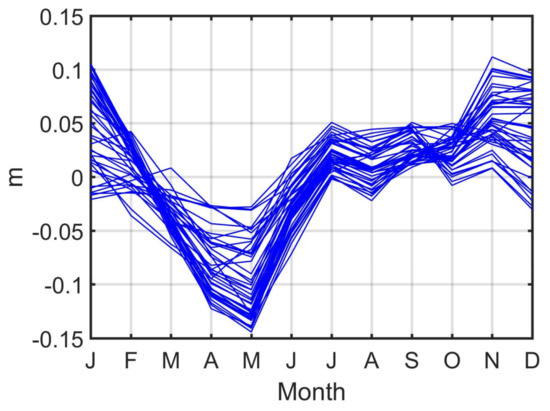 Figure 3 shows the mean seasonal sea level cycle (mm, e.g., average of each calendar month) during 1993–2014 at the selected 42 tide gauges. Despite the large geophysical distance between the stations, most of the records show a well-defined minimum sea level in Spring (April–May) and a relatively broad maximum sea level in winter (December–February) [11]. The patterns of the seasonal cycle are slightly asymmetric and similar at all the selected tide gauges but different from each other on the maximum (varies from 0 to 100 mm) and minimum (varies from −150 mm to −40 mm) seasonal cycle amplitudes. The magnitude and time of the maximum and minimum values relate to the latitude of the stations (e.g., at the entrance and inside of the Baltic Sea) and regional atmospheric conditions [14]. Several stations located at the entrance of the Baltic Sea (e.g., Danish Straits) show maximum sea level in autumn, which may also relate to local ocean dynamic conditions [26].