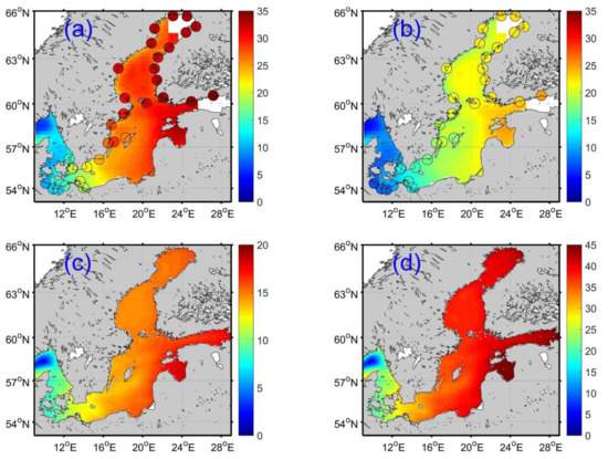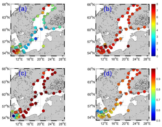 Figure 2e,f show the distribution of standard deviation (STD) of altimetry and SMHI data, respectively. Compared with the overlaid STD of tide gauge data (13–18 cm), altimetry data present slightly lower STD along the coasts of the Baltic Sea. SMHI reanalysis shows a similar spatial pattern of STD as altimetry data, e.g., STD increases from ~11 cm at the entrance to ~17 cm in the interior and in the gulfs of the Baltic Sea. In the coastal regions, higher STD is present in the SMHI data, which fits the tide gauge data better than the altimetry data.