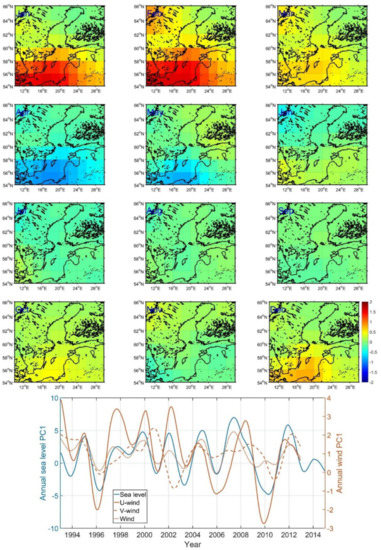 Figure 7 shows the 12 LVs of zonal wind speed from 20CR2 (20th Century Reanalysis V2, [30]) datasets and the PC time series for the period 1993–2012. High positive and negative annual zonal wind speed variations are observed over the southern Baltic Sea during the winter and the Spring, respectively, which may cause the redistribution of water and contribute to the spatial patterns of the annual sea level cycle (Figure 4). In the lower part of Figure 7, the fluctuations of the annual zonal wind speed (e.g., PC time series of the CSEOF first mode) are overlaid with the annual sea level variations. The correlation coefficient of 0.7 ± 0.1 (at 95% confidence level) between the PC time series indicates a significant contribution from zonal annual wind speed on interannual variations of the annual sea level cycle in the period 1993–2012. Moreover, there is no phase difference in the maximum cross correlation between the time series, which indicates a direct effect of zonal wind speed on the annual sea level variability.