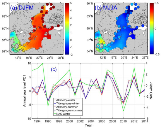Figure 8a,b show the average variations of the annual sea level cycle during the winter months (December–February) and the spring-summer months (May–August) derived from the LVs for the first CSEOF mode, respectively. In Figure 8a, tide gauge data show the consistent positive annual sea level cycle as altimetry data in the coastal regions of the Baltic Sea. In summer (Figure 8b), consistent negative annual sea level cycles are presented from the tide gauge and altimetry data. Figure 8c denotes the seasonal averaged PC time series and consistent temporal variations of the annual sea level cycle from the tide gauge and altimetry data. Figure 8c shows a correlation coefficient of 0.8 ± 0.2 (at 95% confidence level), which confirms the strong relations between interannual variations of the annual sea level cycle and the winter NAO [32], particularly in 1996 and 2010.