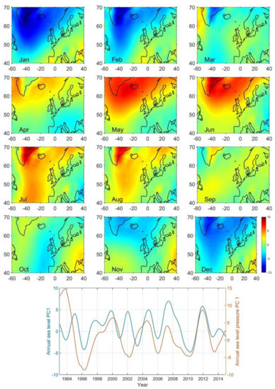 Here, we performed CSEOF analysis to the 20CR2 air-temperature data (in degree K, [30]) in the Baltic Sea over 1993–2012 to study its correlation with the annual sea level variability. The spatial distributions of 12 LVs (Figure 10) demonstrate negative annual air temperature variation in winter and positive variation in summer. The PC time series (over the regions in Figure 1) of the annual air temperature cycle is overlaid with that of the annual sea level cycle in the lower panel of Figure 10. Coherent annual cycle fluctuations between air temperature and SLA are observed, except in 2001. The CC of −0.6 ± 0.1 (at 95% confidence level) is obtained in the time span 1993–2012, implying that the fluctuations of the annual air temperature cycle are also linked to the annual sea level fluctuation (e.g., 1995–1996, 2008 and 2010).
