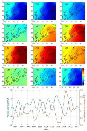 In order to capture the time-varying spatial pattern and temporal variation of the annual sea level cycle, the CSEOF analysis is applied to satellite altimetry, tide gauge data, and SMHI reanalysis, respectively. Figure 4 shows the first mode of CSEOF computed from altimetry data over the time period 1993–2014. It captures the spatial variation of the annual cycle and accounts for 33% of the sea level variability. In Figure 4, the spatial patterns (LVs, color images) denote monthly variations of the annual sea level cycle. The PC time series are normalized (dimensionless) by its mean and denotes the interannual variations of the LVs. Recombining the LVs and PC using Equation (1) produces the contribution of the annual cycle to regional sea level over the length of the record.