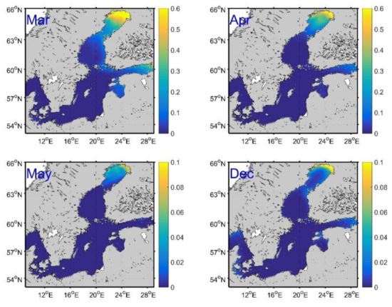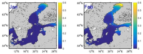 In Figure 4, the CSEOF analysis of altimetry data is not available in the head of Gulf of Bothnia and the Gulf of Finland. The lack of data is attributed to ice-coverage in December to May (Figure 11). In the Gulf of Bothnia, the sea ice thickness computed from the SMHI reanalysis exceeds 0.6 m in the period of February to March (Figure 11), which explains the observed low annual sea level pattern at the edges of the sea ice (February and March in Figure 4). The decrease of the annual sea level is not significant in the Gulf of Finland, which may be attributed to thinner and smaller coverage of sea ice in the regions.