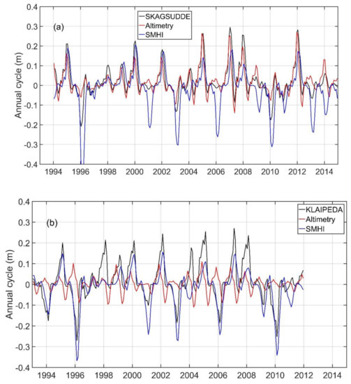 The seasonal cycle is a pronounced feature of long-term sea level variability in the Baltic Sea, which exhibits a minimum in Spring and a maximum in winter [10]. Stramska et al. [11] found a well-pronounced seasonal cycle in the 18-year average sea level (1993–2010) at a specific location (55.44°N, 18.33°E) in the open Baltic Sea based on altimetry data. They found the average amplitude of annual sea level anomaly (SLA) to be approximately 18 cm and asymmetric in shape. Etcheverry et al. [12] computed the annual signal from tide gauges and compared it with information derived from gridded satellite altimetry data. Their results show that the root mean square differences (RMSds) between the datasets are up to 4 cm in the southern Baltic Sea and in regions occasionally covered by sea ice (e.g., the Gulf of Bothnia), and less than 1 cm in other regions.