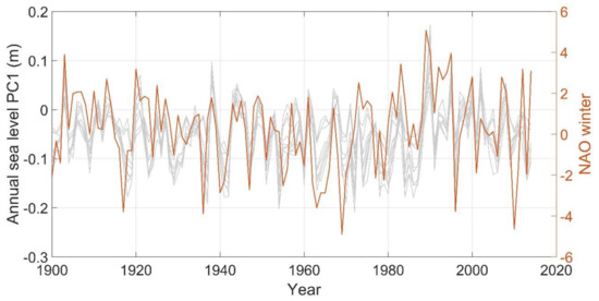 Average of sea level CSEOF first mode PC time series in winter (December–March) at nine tide gauges (Table 2) in 1900–2012. The PC time series of winter-NAO is overlaid.