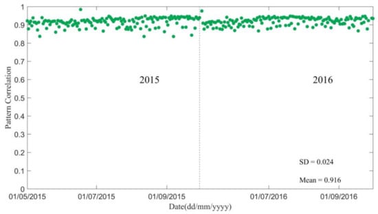 Figure 6 shows time series of the daily spatial pattern correlation of the SMAP L3_SM_P_E product relative to the CLM simulation for the unfrozen periods (1 May–30 September) of 2015 and 2016. The spatial patterns of SM for the SMAP L3_SM_P_E product and the CLM simulation agree well, as indicated by an average pattern correlation of 0.916. Most (75.5%) days have pattern correlations greater than 0.9, and the minimum pattern correlation is 0.836. These consistently large pattern correlations further affirm the high level of agreement between spatial variations in the SMAP L3_SM_P_E product and those produced by the CLM simulation.