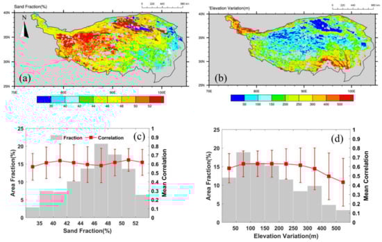 Spatial distributions (top row) of: (a) soil sand fraction (%); and (b) the elevation variations (m) over the Tibetan Plateau. Average correlations between the SMAP L3_SM_P_E product and the CLM simulations across: (c) different soil sand fractions; and (d) different elevation variations. The area fractions represented by each bin are shown as gray bars and the average correlations are shown as red lines, with error bars representing standard deviation of correlations in each bin.