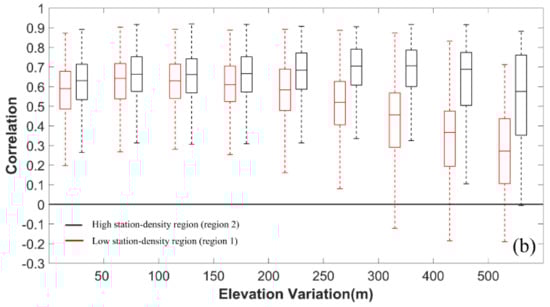 To further analyze the reason behind the smaller SMAP–CLM correlations in the northwestern TP relative to the southeastern TP, changes in correlations as increasing sub-grid elevation variance increases are examined over both regions. Figure 8a shows the distribution of CMA operational stations that produced observations used in constructing the CMFD. Almost all stations are in the southeastern TP, so that the TP can be divided into a low station-density region (Region 1 in Figure 8a) and a high station-density region (Region 2 in Figure 8a). Figure 8b shows a box-and-whisker plots of the correlation across different sub-grid elevation variance bins in the two different regions.