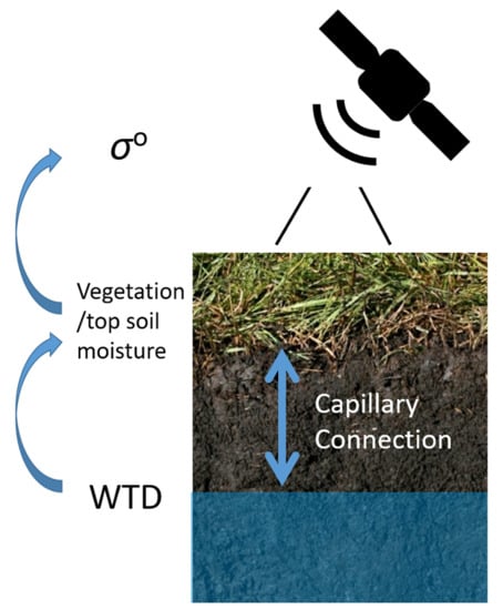 Illustration of the potential link between the remote sensing signal, here backscatter coefficient (σ°), and below-ground water table depth (WTD) via a ‘capillary bridge’, i.e., the capillary-connected top soil and vegetation moisture in shallow water table depth environments.