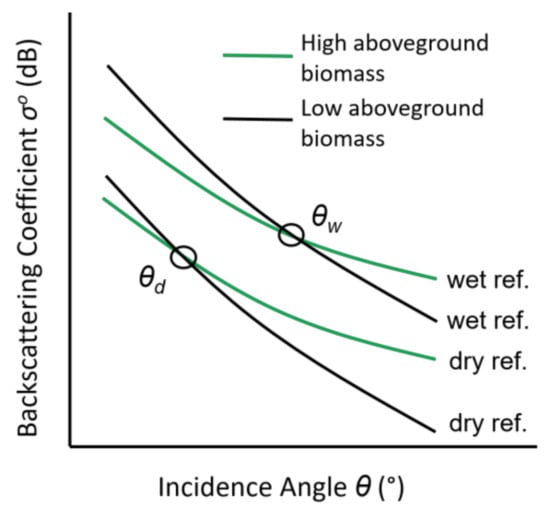Illustration of the dependency of backscatter coefficients (σ°) to incidence angles (θ) with changing aboveground biomass. The slope and curvature are insensitive to soil moisture changes. At the cross-over angles (here indicated for a dry and a wet reference state, θd and θw, respectively), σ° is proposed to be rather independent of vegetation changes [].