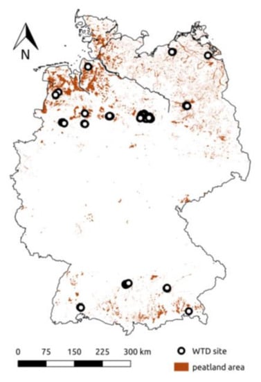 Locations of 179 peatland WTD reference sites across Germany, representing a subset of Bechtold et al. []. The base map (geological map 1:200,000, BGR) shows the distribution of peatlands.