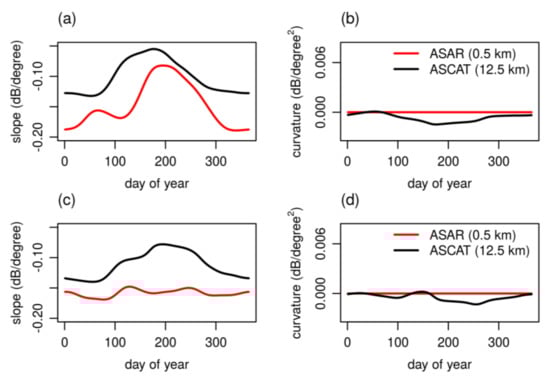 Climatology time series examples of (a,c) slope and (b,d) curvature for two locations (a,b, lat: 53.995°N, lon: 12.233°E; c and d, lat: 53.694°N, lon: 8.822°E). Both footprints were dominated by grassland, but also included contributions from various other land covers. Curvature was not estimated for ASAR and set to 0.