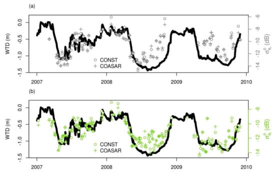 Applications of the cross-over angle concept typically use the dry and wet cross-over angles originally determined over the Iberian Peninsula by Wagner et al. [] like we did here for COASCAT and COASAR. These angles might be suboptimal for an application over peatlands. Moisture contents are much higher in peat than in mineral soils and reach up to about 70–80 vol % in degraded and up to about 80–90 vol % in natural peatlands. Furthermore, the dry and wet reference states over peatlands are not comparable with dry and wet references in mineral soils. Moisture content at the wilting point, which is typically referred to as ‘dry reference’ in mineral soils [], might often not be reached in the top few centimeters of peat soils when a capillary connection to the groundwater reservoir is present over the whole year. Moisture content at field capacity, which is typically referred to as the ‘wet reference’ in mineral soils, is lower than complete saturation occurring in peatlands when the WTD reaches the soil surface.